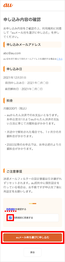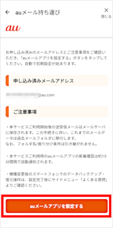 「auメール持ち運び」のWebページでお申し込みいただけます。