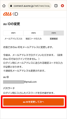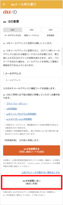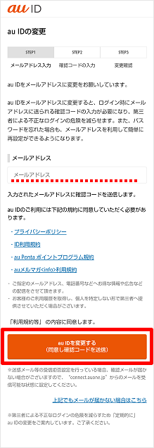 au IDに設定する「メールアドレス」を入力し、[au IDを変更する(同意し確認コードを送信)]をタップします。 ※auメール(@au.com/@ezweb.ne.jp)以外のメールアドレスを設定してください。