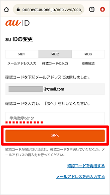 「auto@connect.auone.jp」から届く「確認コード」を入力し、[次へ]をタップします。