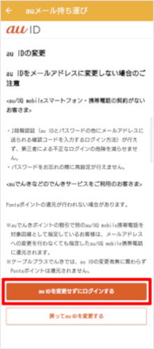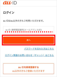 お申し込みになるメールアドレスのau IDを入力し、[次へ]をタップします。 この画面が表示されない場合は手順5に進みます。 ※au IDログイン時にWi-Fi接続している場合、「2段階認証」の操作が必要になる場合があります。