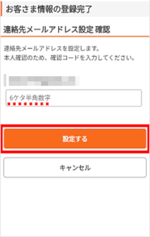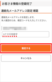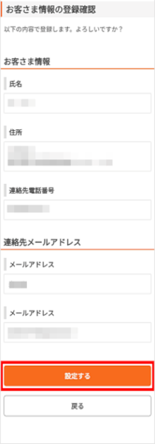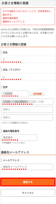 お客さま情報を入力し、[設定する]をタップします。 ※連絡先メールアドレスはauメール(@au.com/@ezweb.ne.jp)以外を登録してください。