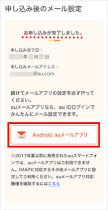 STEP2までの段階で、「auメール持ち運び」の申し込みが完了しました。 続けて「auメールアプリ」の設定です。 [Android auメールアプリ]をタップします。 「auメールアプリ」を再設定する場合は、auメール持ち運びの「マイページ」にログイン後、[メールアプリの設定]→[Android auメールアプリ]の順にタップします。 auメール持ち運びの「マイページ」はこちら