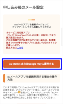 [au MarketまたはGoogle Playに遷移する]をタップします。 ※Chromeのバージョンが最新の場合、[auメールアプリのインストールまたはアップデートはこちら]をタップします。