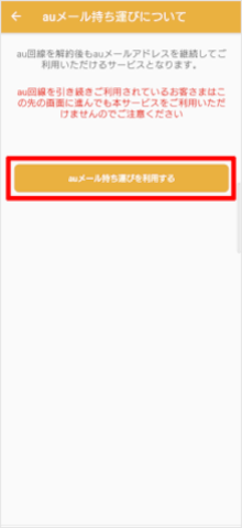 [auメール持ち運びを利用する]をタップします。 ※「auメールアプリ」の画面が表示された場合は、画面左上の[メニューアイコン(三本線)]→[auメール持ち運び]の順にタップします。