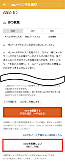 [au IDを変更しない(規約に同意)]をタップします。 ※この画面が表示されない場合は、手順10に進みます。