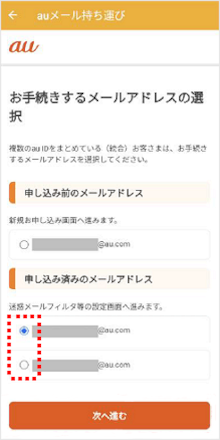 この画面が表示された場合は、[設定するメールアドレス]を選択します。 ※「auメール持ち運び」に申し込みいただいているメールアドレスが複数ある場合に表示される画面です。 この画面が表示されない場合は手順12に進みます。