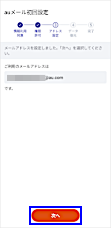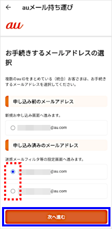 「auメールアプリ」に設定する「メールアドレス」を選択し、[次へ進む]をタップします。 ※「auメール持ち運び」に申し込みいただいているメールアドレスが複数ある場合に表示される画面です。 この画面が表示されない場合は、次に進みます。