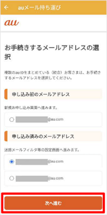 この画面が表示された場合は、auメール持ち運びに申し込むメールアドレスを選し、[次へ進む]をタップします。 ※この画面が表示されない場合は手順9に進みます。