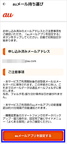 すでにauメール持ち運びをご利用されており、機種変更などで再設定する場合も改めて「auメールアプリ」で設定が必要です。