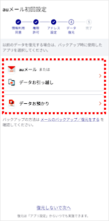 [auメールまたはデータお引っ越し]もしくは[データお預かり]をタップします。