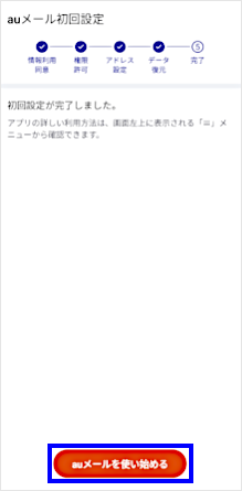 [auメールを使い始める]をタップすると、「auメールアプリ」のトップ画面へ戻ります。 以上で設定は完了です。