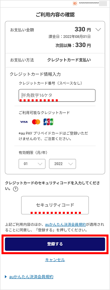 「クレジットカード番号」と「セキュリティコード」を入力し、[登録する]をタップします。 以上で、auメール持ち運びの申し込みが完了しました。 続けてSTEP3にお進みください。