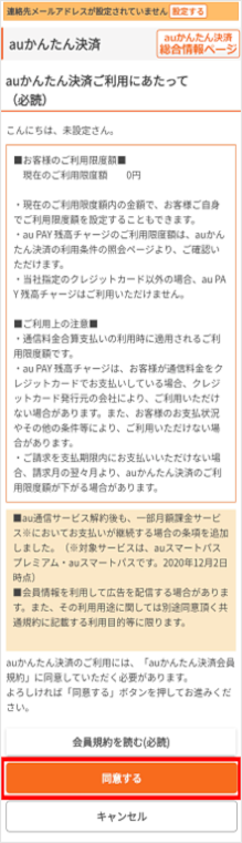 利用規約を確認し、[利用規約に同意する]のスイッチをタップしてチェックを入れ、[auメール持ち運びに申し込む]をタップします。 次に「au PAY(auかんたん決済)」でのお支払いを設定します。STEP2のお客さまの状況に合う項目にお進みください。