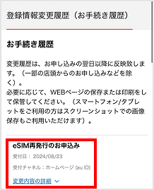 My au(Web)の「登録情報変更履歴(お手続き履歴)」にてご確認いただけます。 登録情報変更履歴(お手続き履歴)はこちら