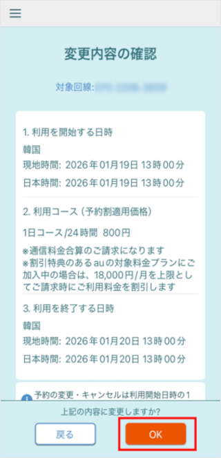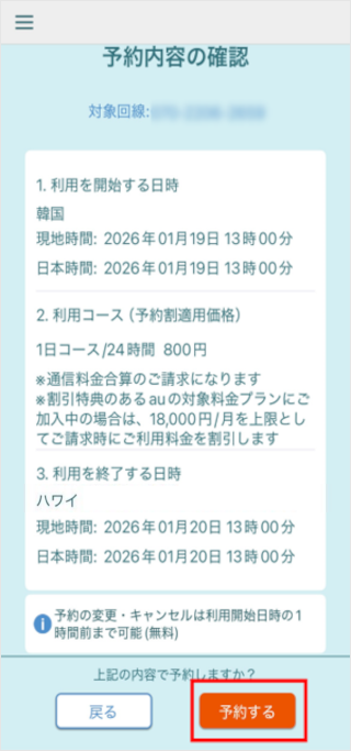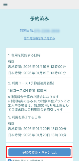 「au海外放題アプリ」で、事前予約の内容を変更できます。