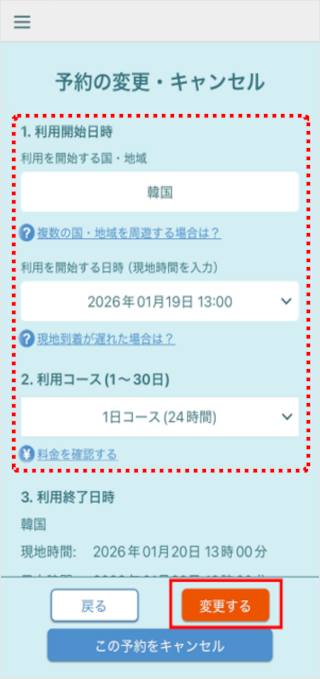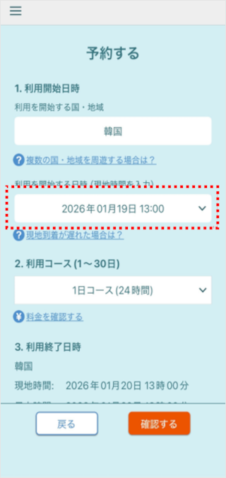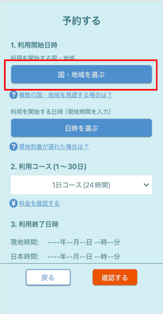 利用終了日時の国・時間を確認します。 利用終了がほかの国・地域になる場合は、[利用終了が他の国・地域になる場合はこちらから選択]をタップし、対象国を選択します。 最後に、[確認する]をタップします。