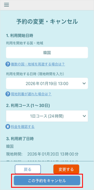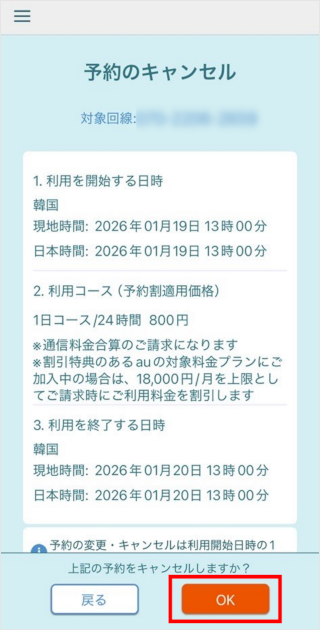 「au海外放題アプリ」で、事前予約をキャンセルできます。
