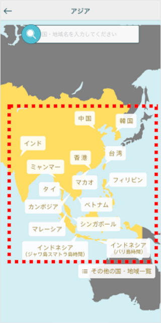 渡航予定の国・地域を検索、またはエリアを選択します。 (画面を左右にスライドするとほかの地域も表示されます。) ※ここでは例として地域を選択します。