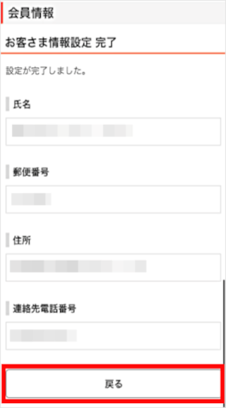 変更が完了しました。 [戻る]をタップすると「会員情報」に戻ります。