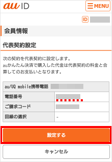 代表契約に設定したい電話番号の[設定する]をタップします。