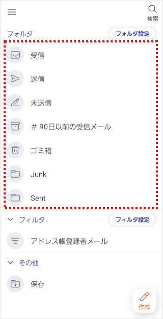 保存したいメールのフォルダをタップします。 ※ここでは「受信」を選んだ場合の画面でご案内します。