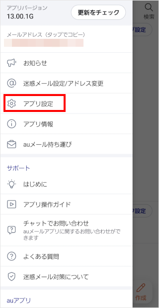 [アプリ設定]をタップします。 ※アプリのバージョンによっては[Eメール設定]の項目が表示されるため、そちらをタップします。