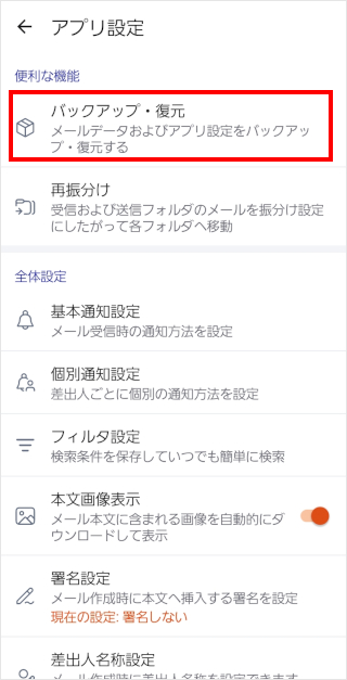 アプリ内の過去メールデータが削除されるため、バックアップが必要な場合は、あらかじめ「STEP1:メールのバックアップまたは転送」の手順で操作を行ってください。 アプリ内のデータ削除方法は以下のとおりです。