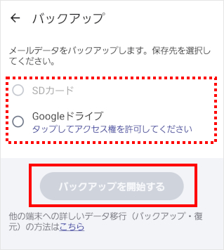 SDカードまたはGoogle ドライブを選び、[バックアップを開始する]をタップします。