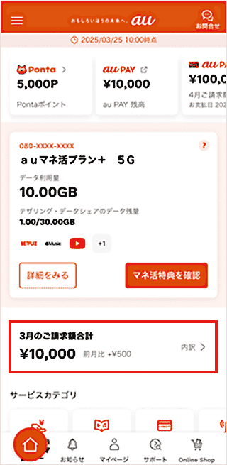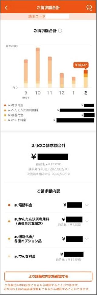 月々のご利用内訳はMy auからご確認いただけますので、未払いとなっている請求月の内訳をご確認ください。
