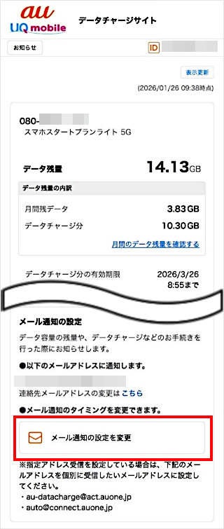 「データチャージサイト」で、通知を受ける時間帯や通知の停止を設定できます。