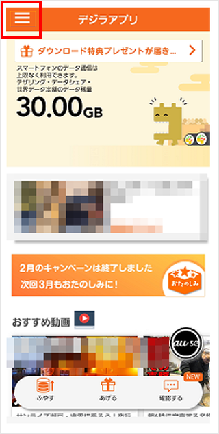 [デジラアプリ]を起動します。 デジラアプリのダウンロードはこちら ※アプリ起動後、au IDのログインに関して表示される場合は、画面の指示に沿ってログインします。