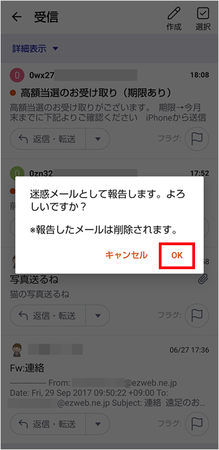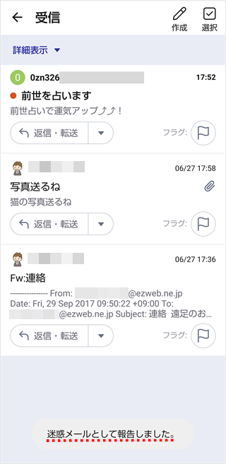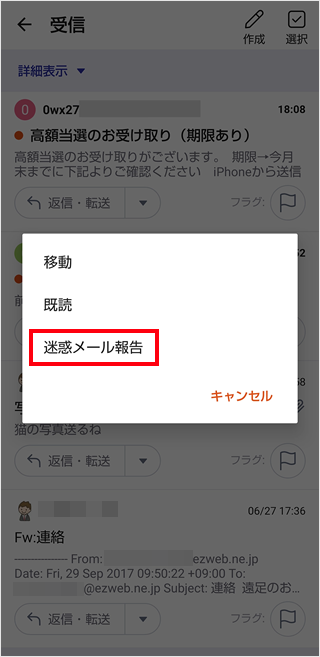 auメールアプリの受信欄で迷惑メールの報告をすることができます。