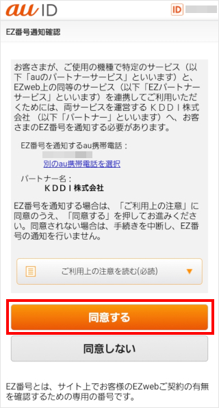 「EZ番号通知確認」が表示された場合は内容をご確認の上、[同意する]をタップしてください。