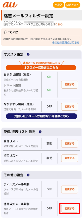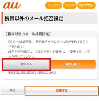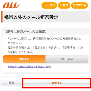 画面をスクロールし、「携帯以外メール規制」の[変更する]をタップします。