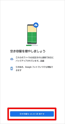 [空き容量を○GB増やす]をタップすると、スマートフォン内のすべての写真・動画が削除されます。