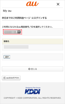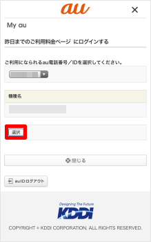 au電話番号/auひかりなどの契約番号を選んだ上で、[選択]をタップします。