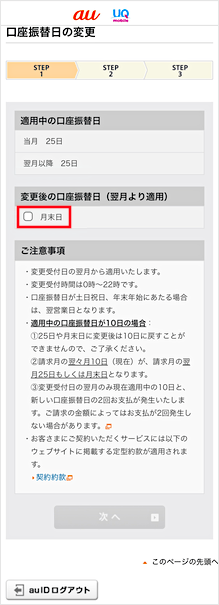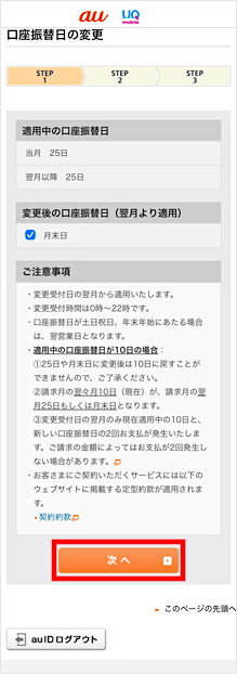 口座振替日を変更したいau電話番号/auひかりなどの契約番号を選択します。