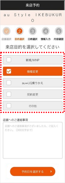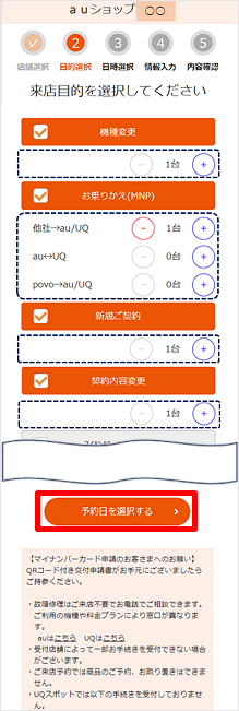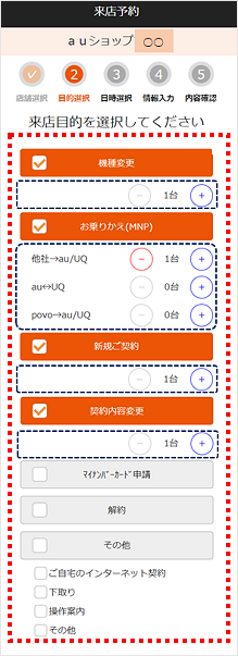 「来店目的」と「台数」を選択します。 ※来店目的は5つまで選択できます。(「その他」を選択した場合、メモ入力が必要です。)
