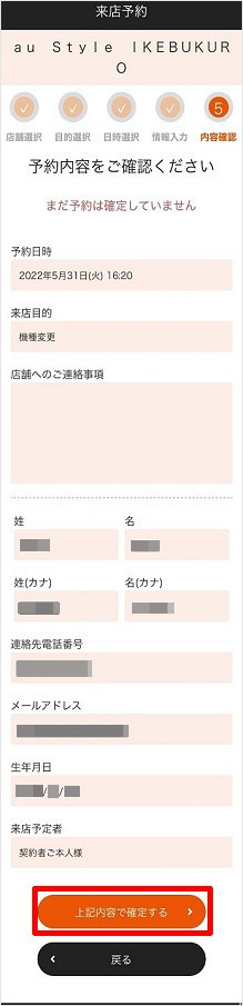 予約内容を確認し、[上記内容で確定する]をタップします。
