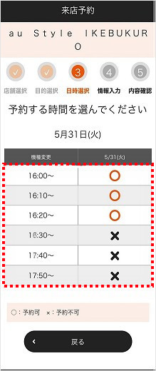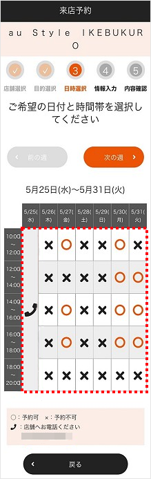 予約可能な日時の中で、「ご希望の日付と時間帯」を選択します。 ※電話マークの場合は、お電話で店舗にご確認ください。