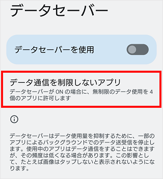 ※データセーバーを使用しない場合は、「データセーバーを使用」のスイッチをタップしてオフにします。