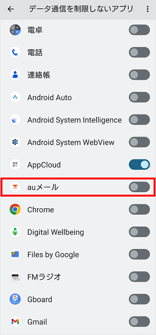 「auメール」のスイッチをタップしてオンにします。