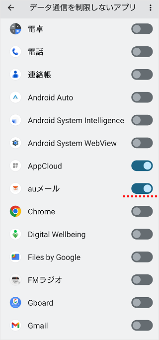 その場合、データセーバーの設定で、auメールアプリを「データ通信を制限しないアプリ」に設定することで改善されます。