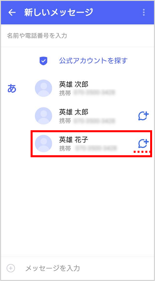 ※連絡先の右側に+メッセージのアイコンが表示されない場合はSMSでの送信となります。