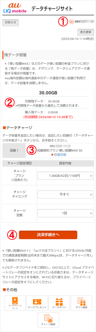 データチャージサイトでは、データ容量に関する手続き・利用状況の確認などができます。