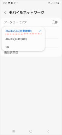 [5G/4G/3G(自動接続)]/[4G/3G(自動接続)]のどちらかを選択します。 ※海外で通話やデータ通信の品質が悪い場合は、「ネットワークモード」を「3G」に切り替えると改善されることがあります。