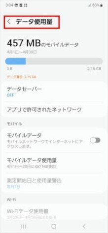 [データ使用量]をタップして1つ前の画面に戻ります。