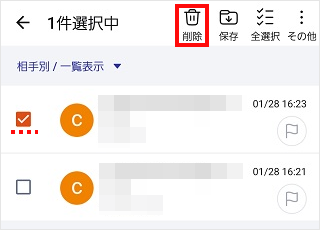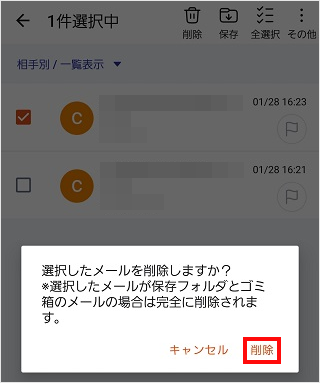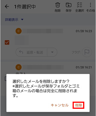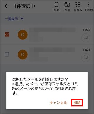 チェックを入れたら[削除]をタップします。 ※削除するメールは複数選択することもできます。すべてのメールを削除したい時は[全選択]をタップ後、[削除]をタップします。