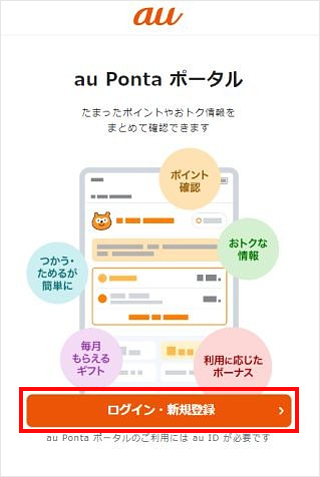 「au Ponta ポータル」にアクセスし、[ログイン・新規登録]をタップします。