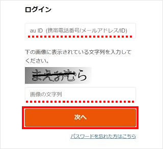 au IDと指定の文字を入力し、[次へ]をタップします。